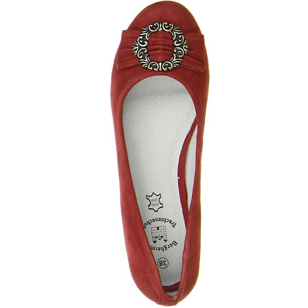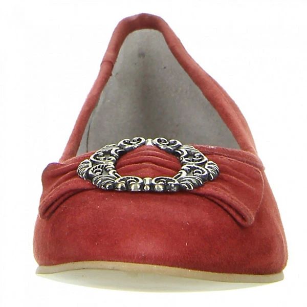 Wie ein original Ballerina-Schuh geformt sind sie komplett aus Leder gefertigt und tragen den typisch elastischen Einstieg. Was den Schuh aber so besonders macht, ist die breite, Schleife mit Spange auf dem Vorderblatt. Die obere Schicht der Schleife ist mit Metall-Applikationen veredelt und schafft so einen besonders edlen Trachten- Look.