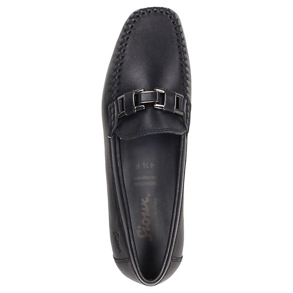 Flacher Damenslipper in Mokassin-Machart in F-Weite aus handschuhweichem Lammnappa gefertigt. Beste Passform, zeitlose Eleganz und als Blickfang eine Garnitur in Metall-/Lederkombination. Ausgestattet mit Kalblederfutter und weich gepolsterter, durchgehender Kalbleder-Decksohle. Weiche und feine Gummisohle mit flachem Absatz. Ein typischer Damen-Mokassin von Sioux.