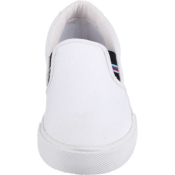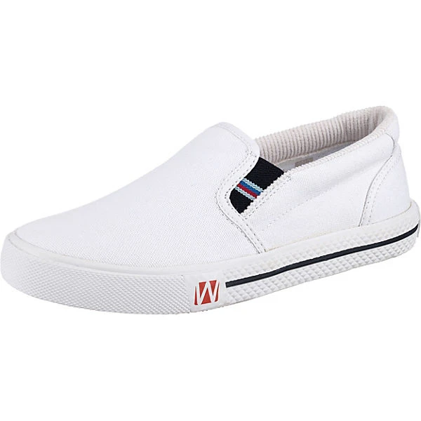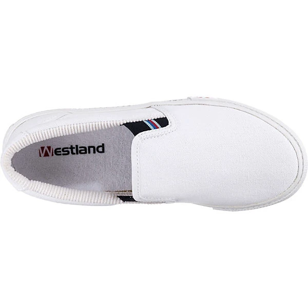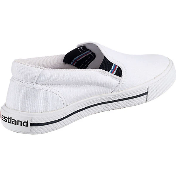 Westland Herren sportliche Slipper/ Slip-on-Sneaker LASER Weiß Textil – Ziernähte – gepolsterter Einstieg – verstärkte Ferse – Stretcheinsätze seitlich vom Spann mit bunten Streifen – gepolstertes Wechselfußbett – flexible, rutschhemmende Laufsohle mit Bumpern